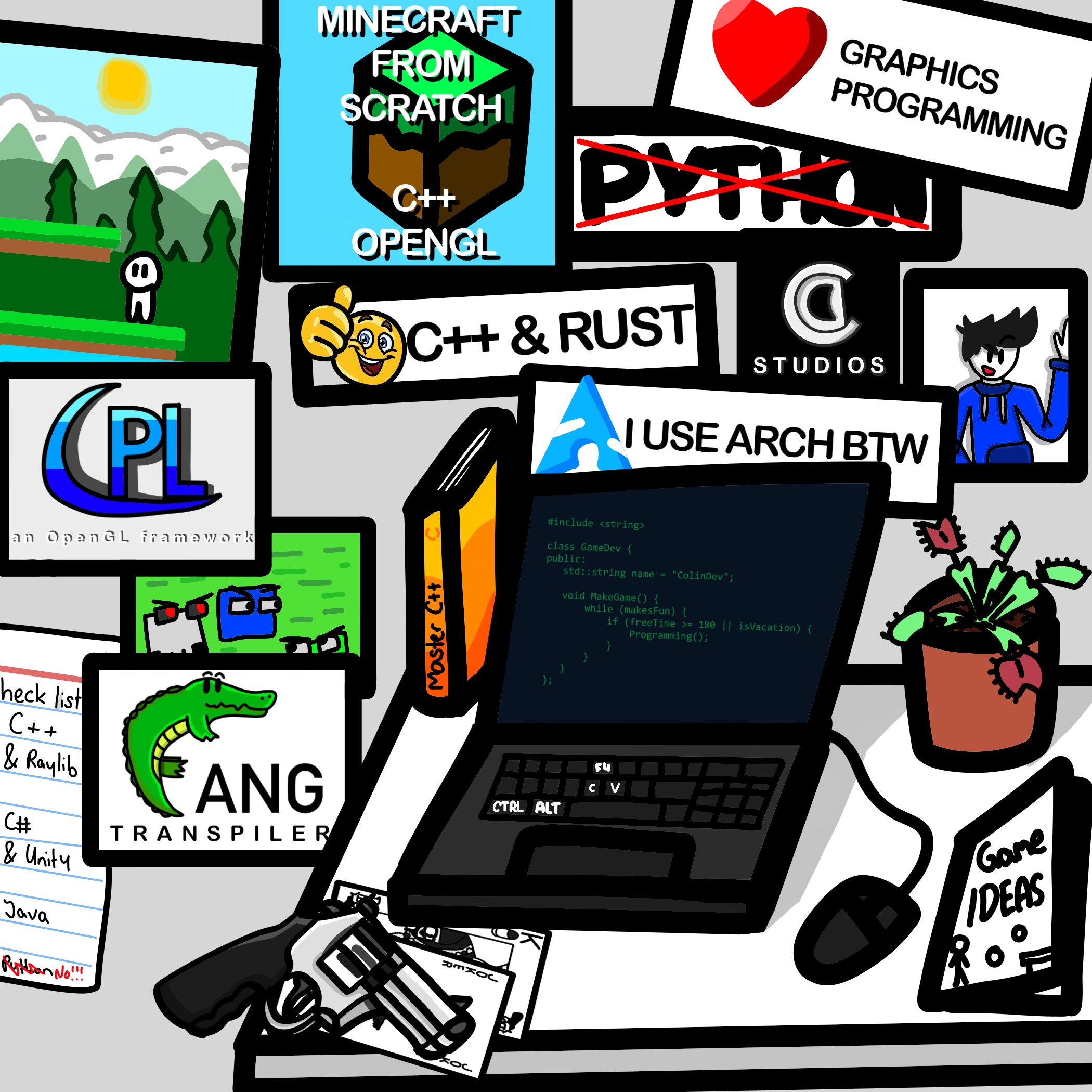 My name is Colin (who would have guessed that) and I still go to school but likes to make games nevertheless. I used for my first games the Unity Engine with C# for 2 years but now spending my time on learning low level programming with C++ and the Raylib library for 4 months. Now I literally make my own framework using OpenGL (I use NeoVim btw.).